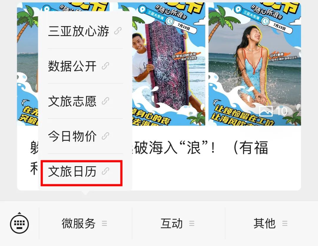 1.  迈入“三亚旅行旅文”微信朋友圈公众平台号工具栏栏的『微贴心服务』—『文化旅游手机日厉』或直观扫描器右上角“文化旅游行为手机日厉”公众号二维码。