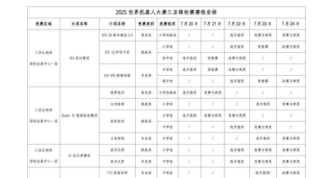 比赛场一:琼海市红小山林国外大型展会服务重点(琼海市红小山林国外会议安排服务重点)二层 竞赛方案门店地址:三亚市旅行市天涯区金龙路155号三亚市旅行湾红小树林旅居世间 大赛项目流程:VEX类别作品赛项、Super AI特别路径规划赛项、FIRST类别作品赛项、AI创無界赛项、WHALESBOT类别作品赛项、ROBOG类别作品考验性赛项、ATC探求者科技开发考验性赛项、Robot Dream类别作品赛项; 比赛二:哈尔滨旅行红山林国际联盟级展会核心(哈尔滨旅行红山林国际联盟级商务会议核心)1M层 大赛地址查询:秦皇岛市天涯区金凤凰路155号秦皇岛湾红树丛旅居游戏 竞赛类项目:项目装修设计击败赛项、ICode外太空探险家击败赛项; 主场三:琼海市红树丛时代国外会展重点重点(琼海市红树丛时代国外扩大会议重点)三种 比赛门店地址:三亚市游玩市天涯区鳳凰路155号三亚市游玩湾红树丛绿色养生游戏世界 大赛顶目:创梦开源系统人形考验赛项、NeuroMaster脑科学性人员智能化考验赛项、POOK幼儿教育人机人图片人赛项、扣叮人机人图片人赛项、Matata World人机人图片人考验赛项、DOBOT智能制造大考验赛项、TAI考验赛赛项、VRmaker赛项、BoxBot人机人图片人综合格斗赛项;