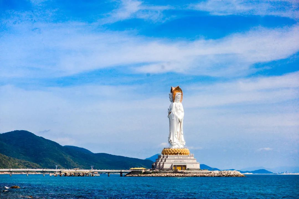 三亚拥有丰富多样的文化资源。同一座山的一侧是道教文化,另一侧是佛教文化。参观东天公园后,您可以前往邻近的南山旅游文化区。这里耸立着世界最高的观音雕像,高108米的南山观音雕像,十分壮观浩然。根据佛教经典,仁慈的观音菩萨发出了十二条使人们免于苦难的愿望,其二是人们可以永远住在南山。中国著名的谚语“福如东海,寿比南山”(“南山”的字面意思是南部的山),也指出了南山与幸福长寿在中国文化中的紧密联系。